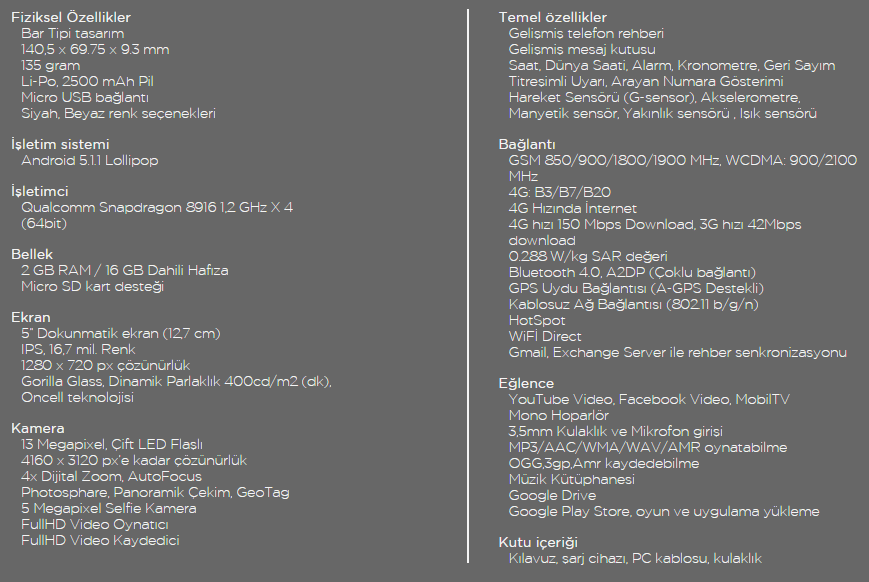 Şüphesiz telefonun dikkat çeken en önemli özellikleri güncel Android sürümüne (Lollipop 5.1.1) sahip olması ve henüz ülkemizde bulunmayan 4G LTE teknolojisini desteklemesi. Bu fiyat segmentinde pek alışık olmadığımız özelliklere sahip olmadığını söylemek yerinde olacaktır.